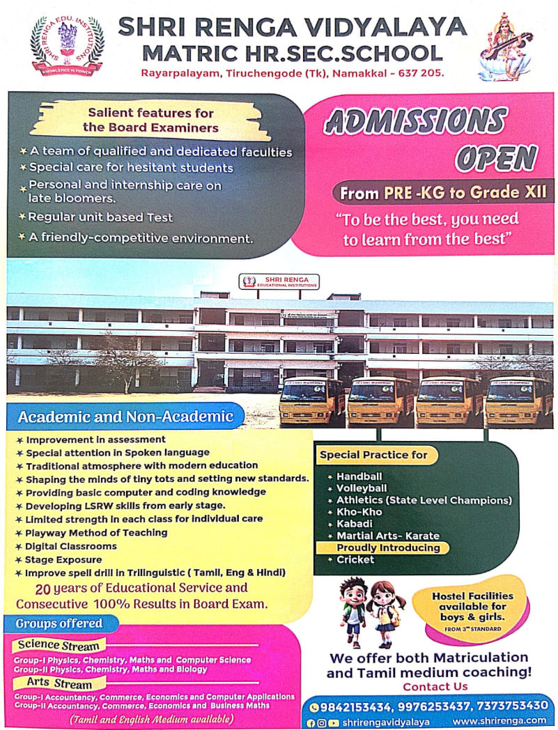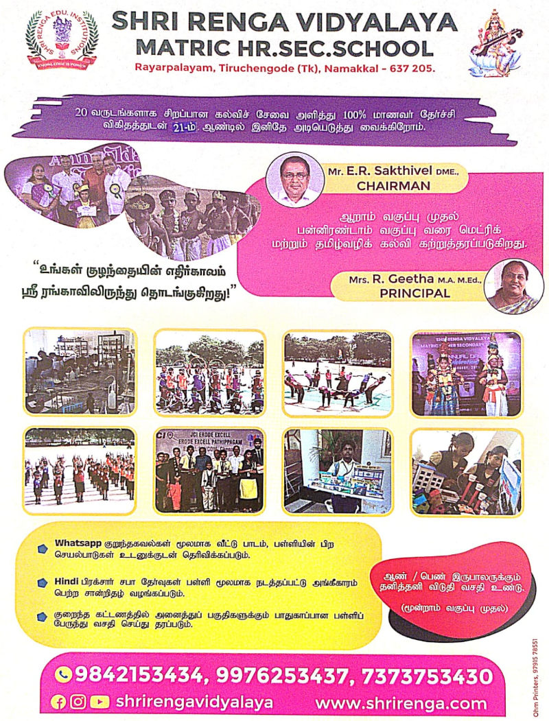 Shri Renga Vidyalaya Matric Hr. Sec. School, Rayarpalayam, Tiruchengode (Tk), Namakkal, was established with a noble vision: to provide quality education in rural areas and empower children with knowledge, discipline, and confidence. For over 19 years, we have been delivering 100% results in board exams, shaping young minds into responsible future leaders.